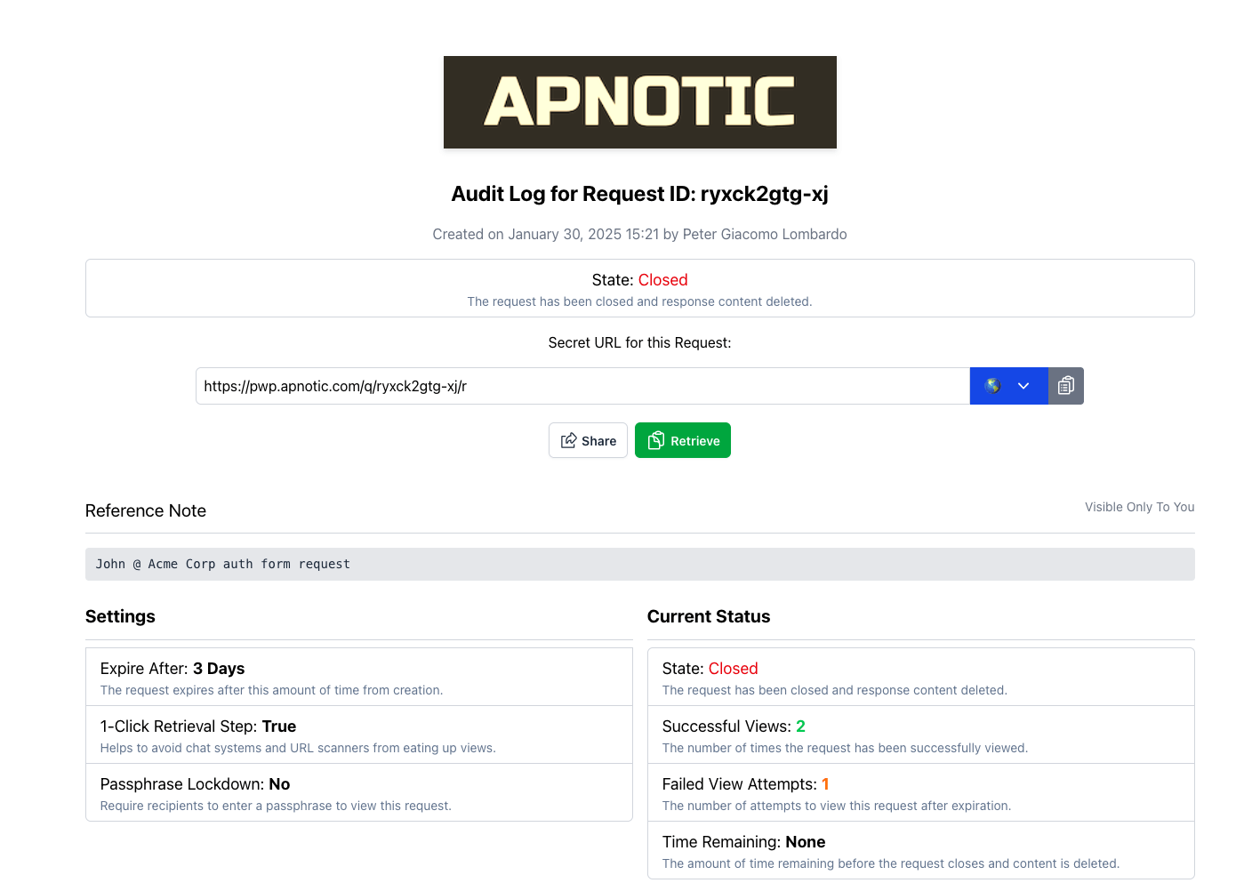 Read more about Password Pusher Requests in our documentation. File attachments (up to 4GB), branding, custom domains and more are available with a paid subscription.