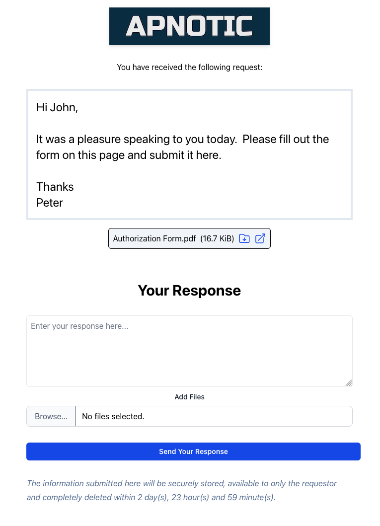 Recipients can submit text responses, file attachments, or both — through a mobile-friendly interface that requires no account to use.